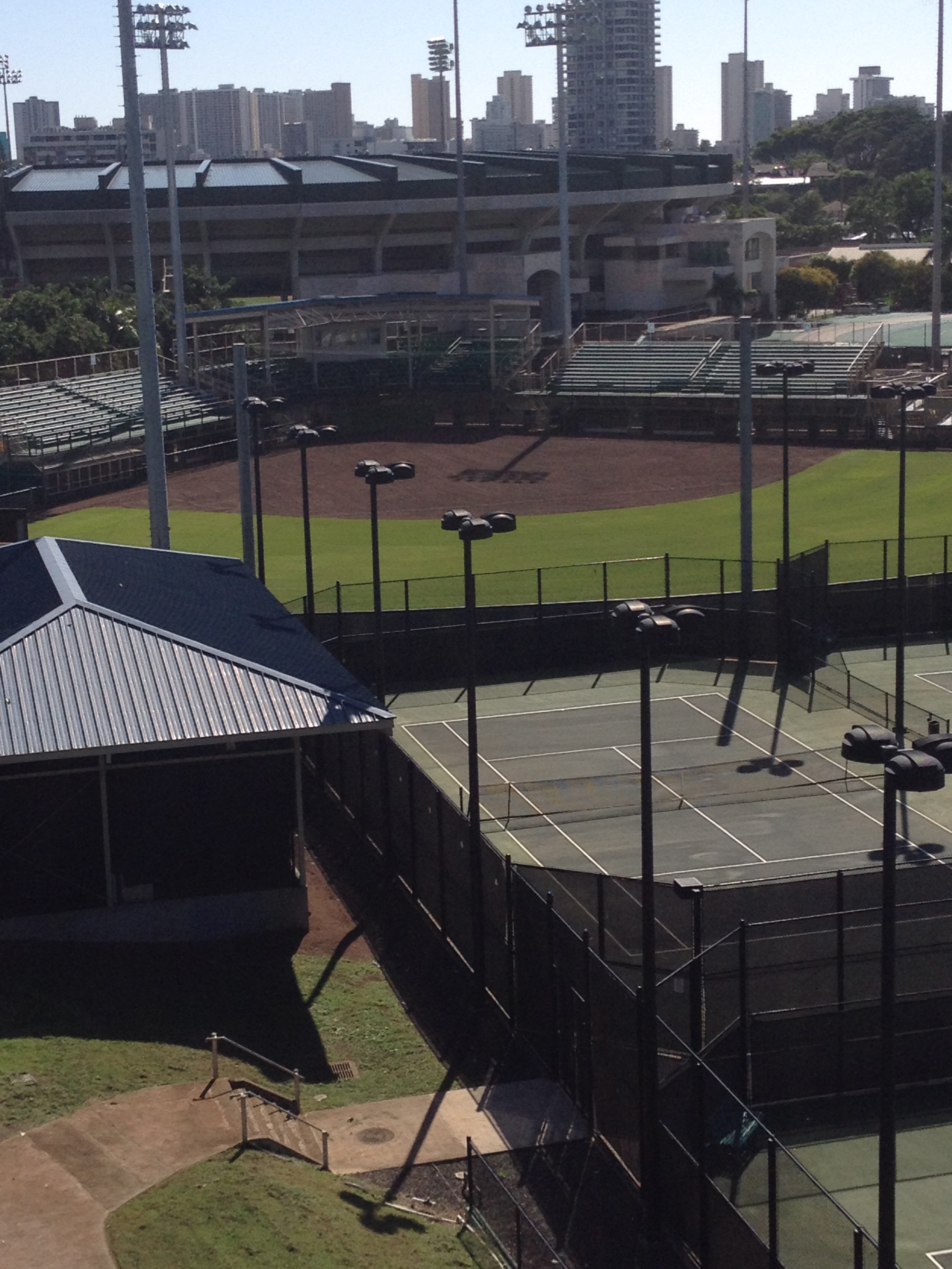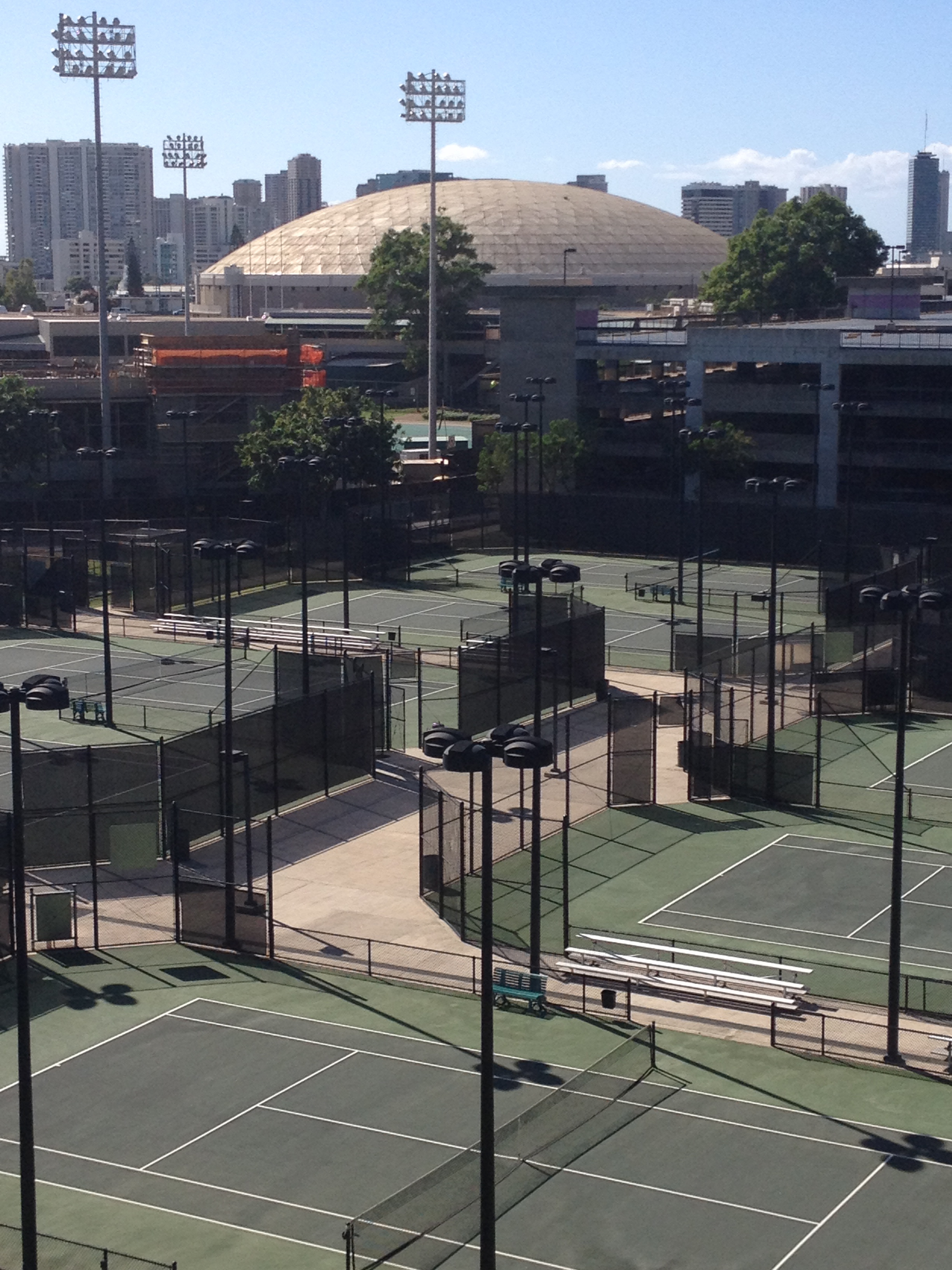 Tennis courts, parking structure, and Stan Sheriff Center.